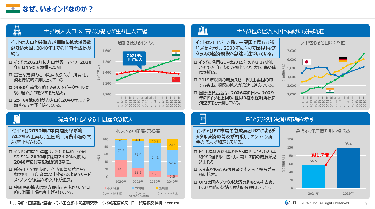 本レポートでは、インドの基本データ、経済動向、消費者トレンドなど、進出検討に不可欠な情報を体系的に整理しています。